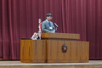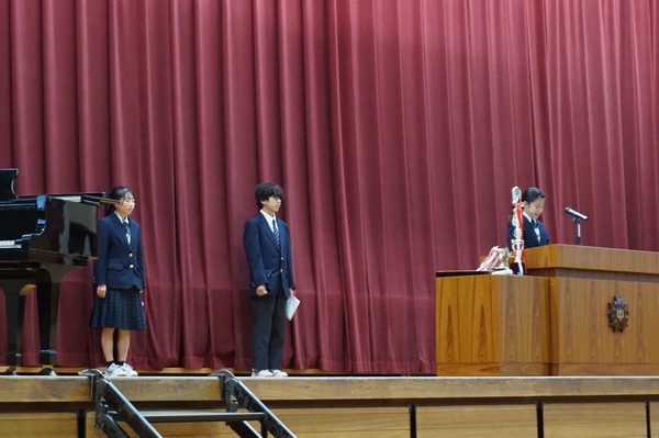 各学年の代表生徒による振り返りでは、1年生は、コミュニケーションと目的意識が高まった一方、自分の気持ちを優先した行動が多いという課題があり、「できることを増やしていきたい」と3学期に向けた決意を語りました。2年生は、「場に応じた雰囲気づくりができるようになった。行事を通して団結力がさらに高まった。アンケートで高まった『学習』については、3学期チャレンジをしていきましょう。」と抱負を語りました。3年生は、「個人として、集団として成長ができた。互いに教え合う雰囲気ができてきた。自己管理能力が課題なので、3学期に高めていきたい。」と発表しました。