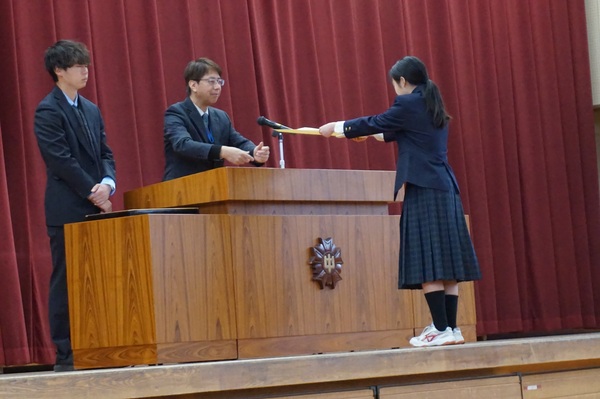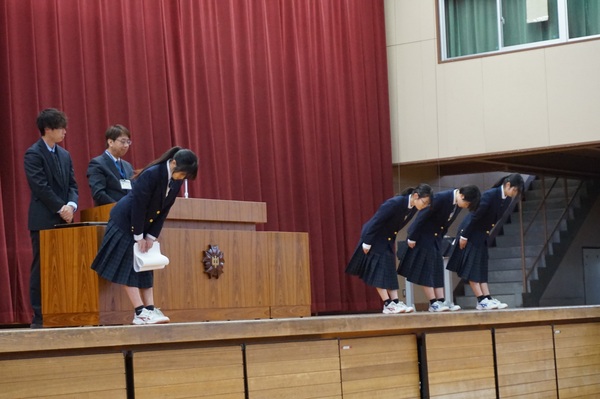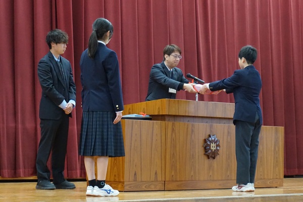 各学年代表からは、1年間の振り返りについて話をしました。1年生は、「さまざまな体験を通して日々成長できた。一人ひとり同じ目標に向かって取り組むことができた。一人ひとりが次の行動を考え、行動する力が身についてきた。」という成果と「テスト計画を立てることはできたが、実行できていない。集中力がなくなっていく。授業中のメリハリをもっとつけたい」という課題、2年生は、「一人ひとりが思いやりをもった言動ができるようになった。自分から率先して動く人が増えた。」という成果と「チャイム着席ができなくなってきた。先を見通して行動したい」という課題を発表しました。