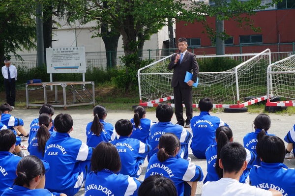 本日、地震発生を想定した避難訓練・引き渡し訓練を行いました。静かに、落ち着いて校庭まで安全に一時避難し、その後、集団下校・引き渡し訓練を行いました。校長先生の講評では「短時間で避難することができた。保護者の方と避難場所を確認する機会にしてほしい。まだ確認していない人は、自分から話題を出して話してほしい。また、集団下校のときには、危ない場所がないかという視点でよく見てほしい。」と話しました。自分事として考え、実践する姿こそ、川通中が今年度目指す「社会で活躍するエージェンシー」を発揮している姿です。